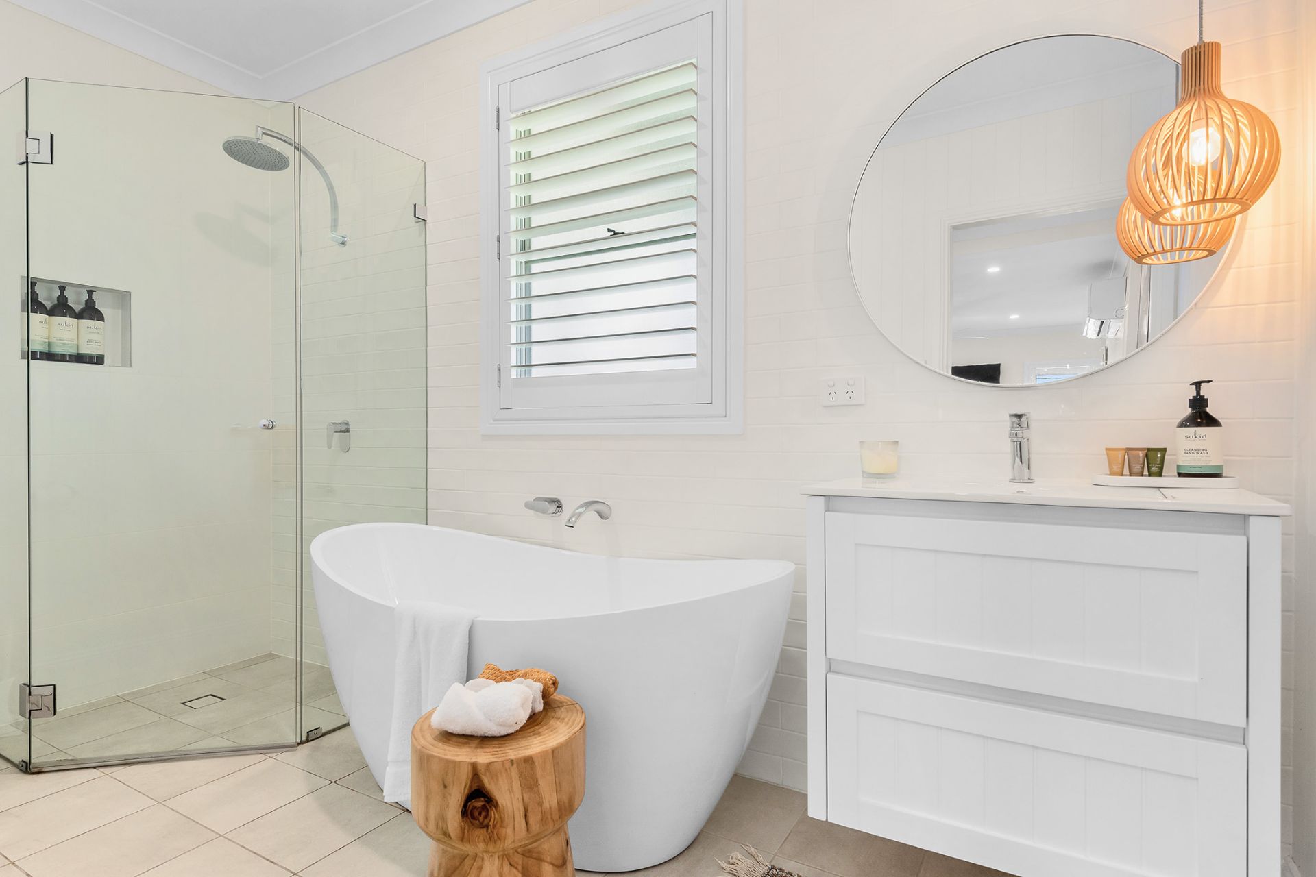- As new luxe bathroom with free standing bath, floating vanity &white shutters