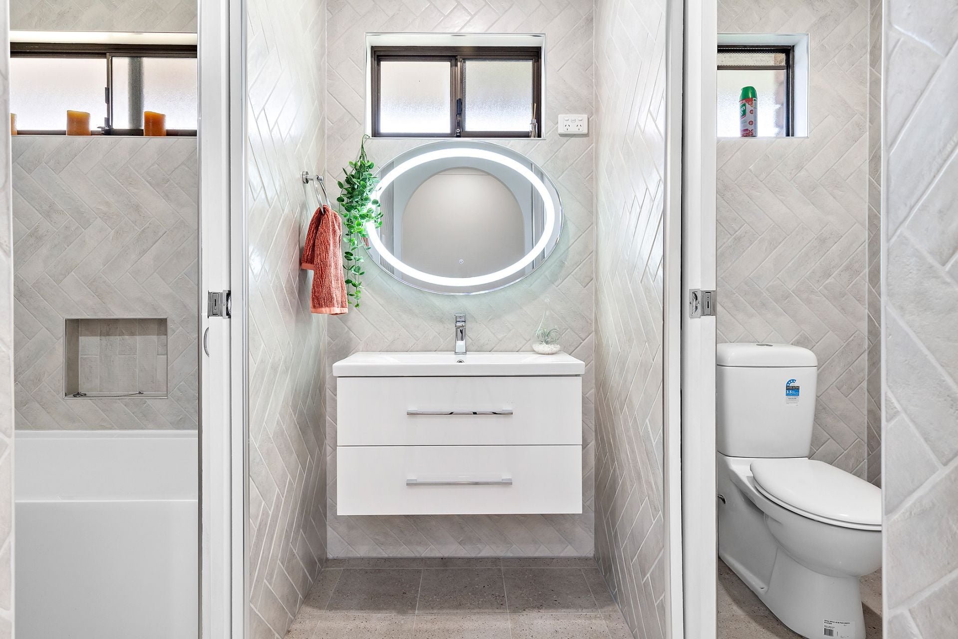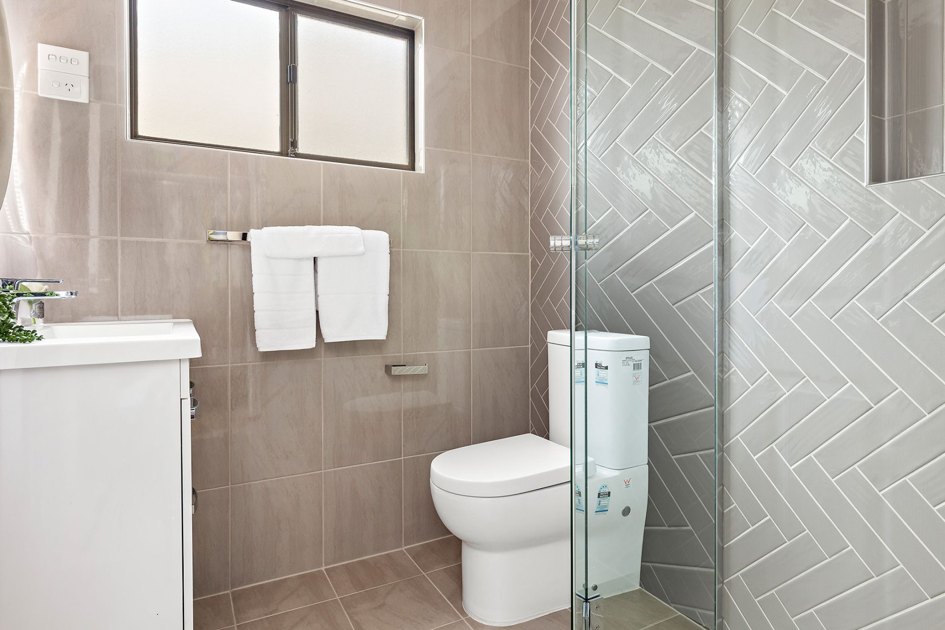 - Full height, feature wall tiles in bathroom and ensuite with herringbone lay