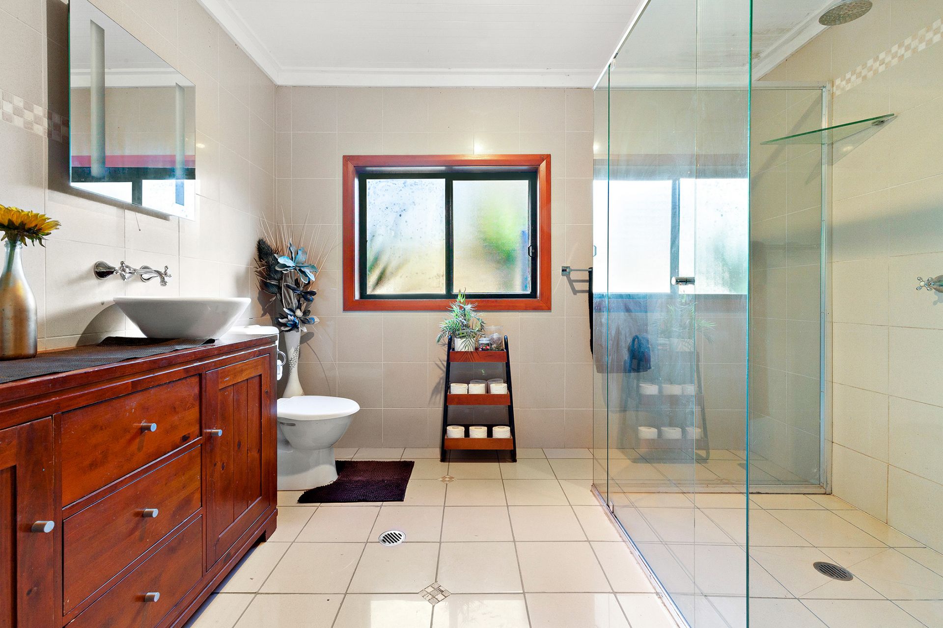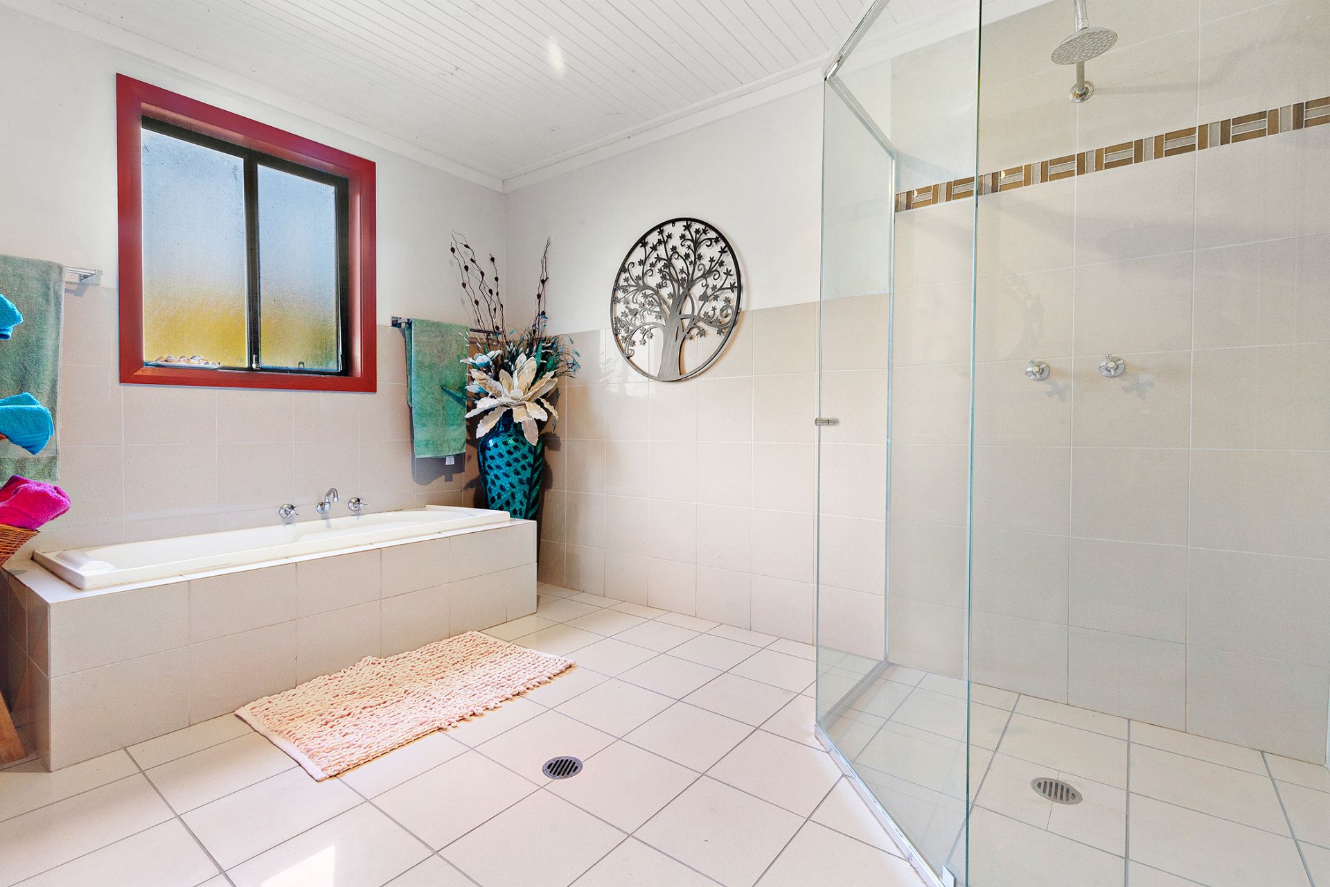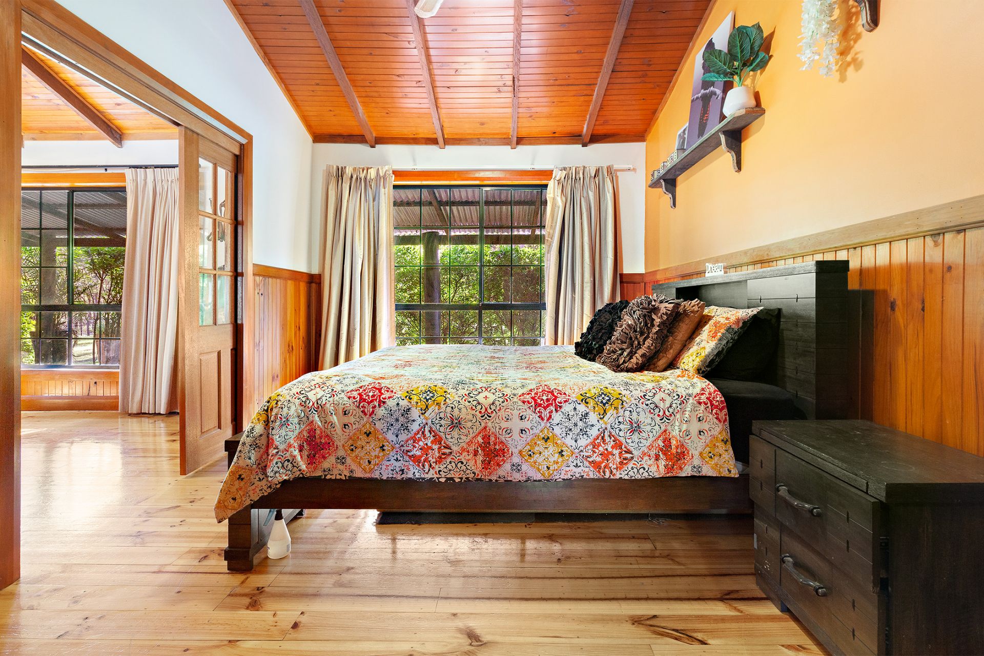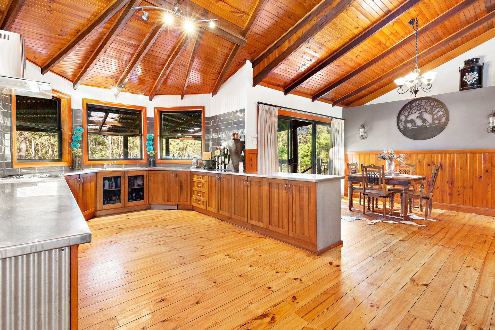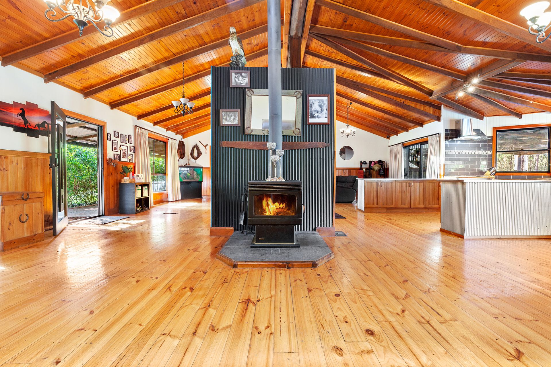 - Cathedral timber ceilings and exposed timber beams. Split system A/C, ducted A/C and fireplace