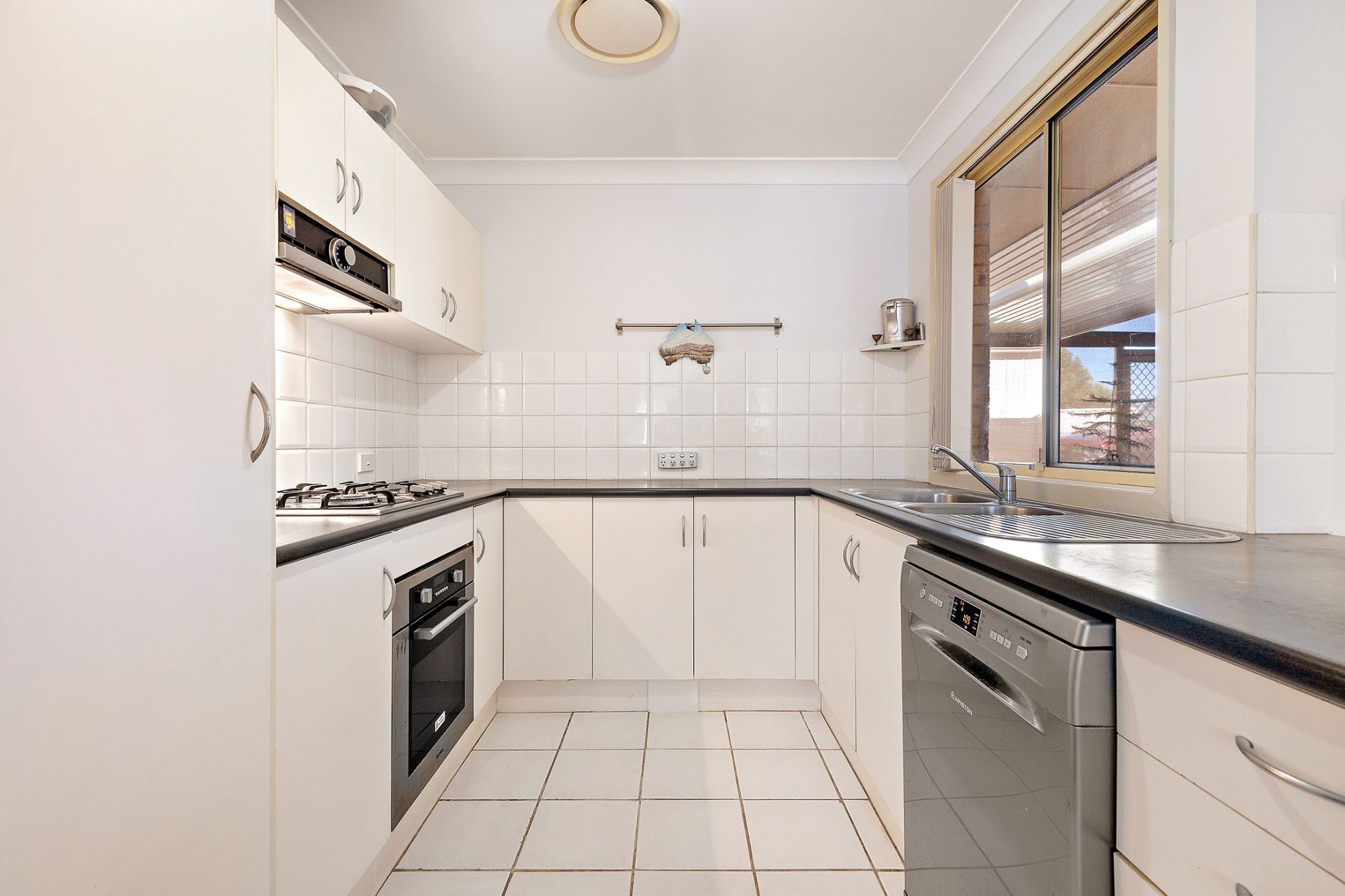 - Kitchen with gas cooking, electric oven, dishwasher and white tiled splash back