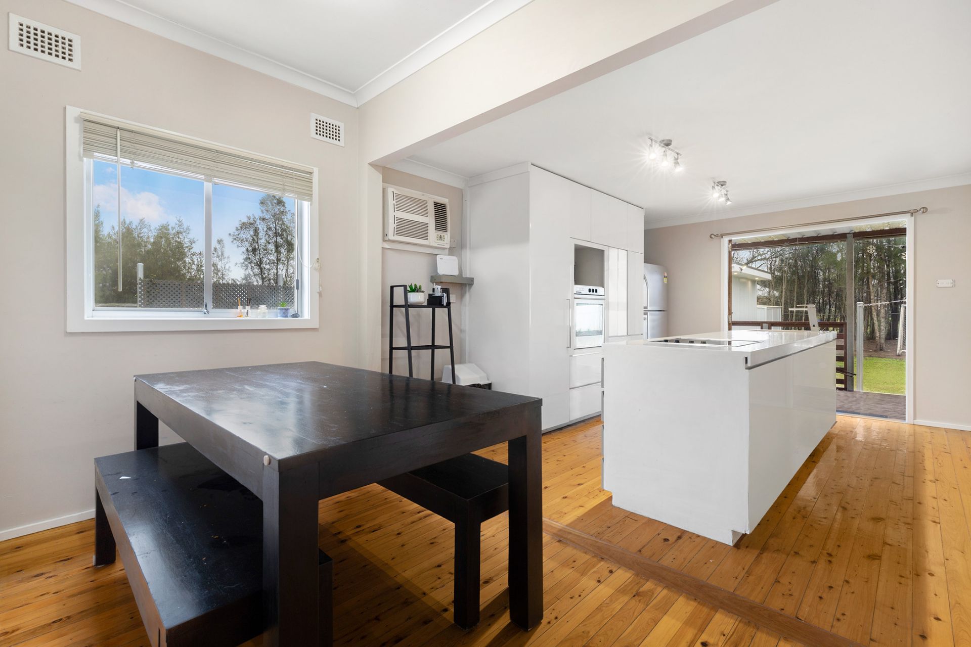 - Modern kitchen, dishwasher, electric cooking, adjacent dining, double French doors to rear deck