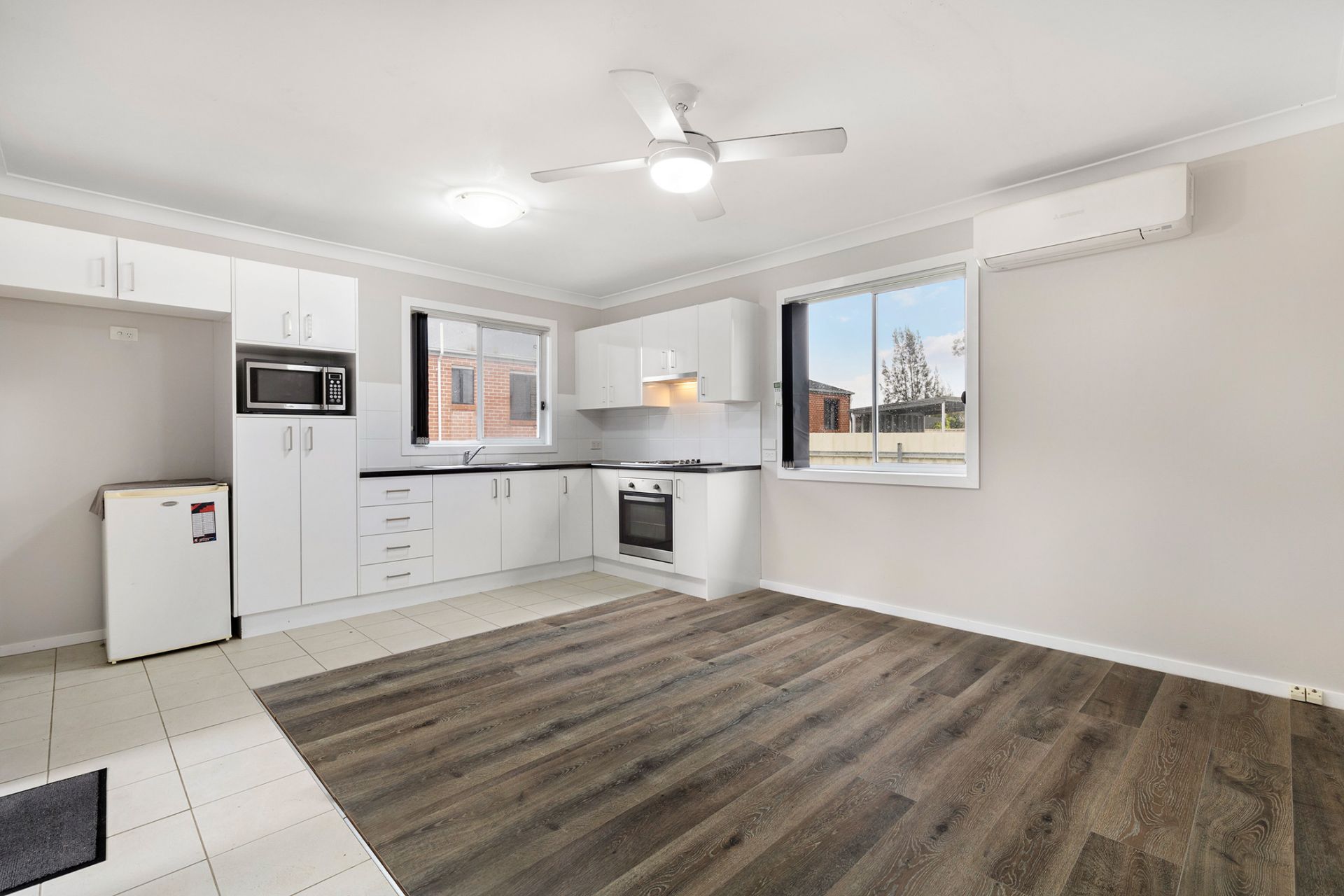 - Detached one-bedroom studio, lined with gyprock, floating flooring, split system a/c and LED lighting