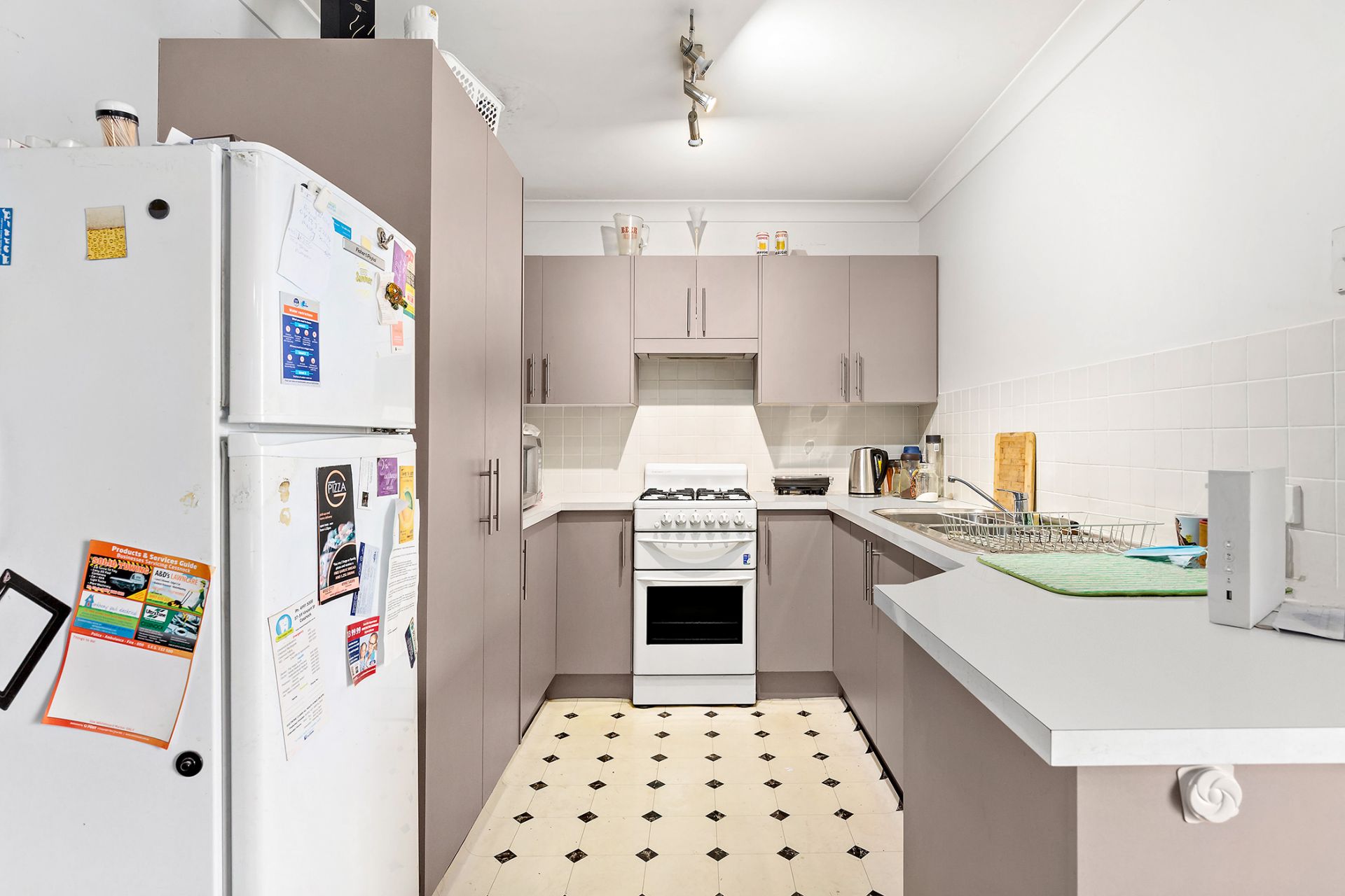 - Functional neutral and white kitchen with gas cooking and tiled splash back