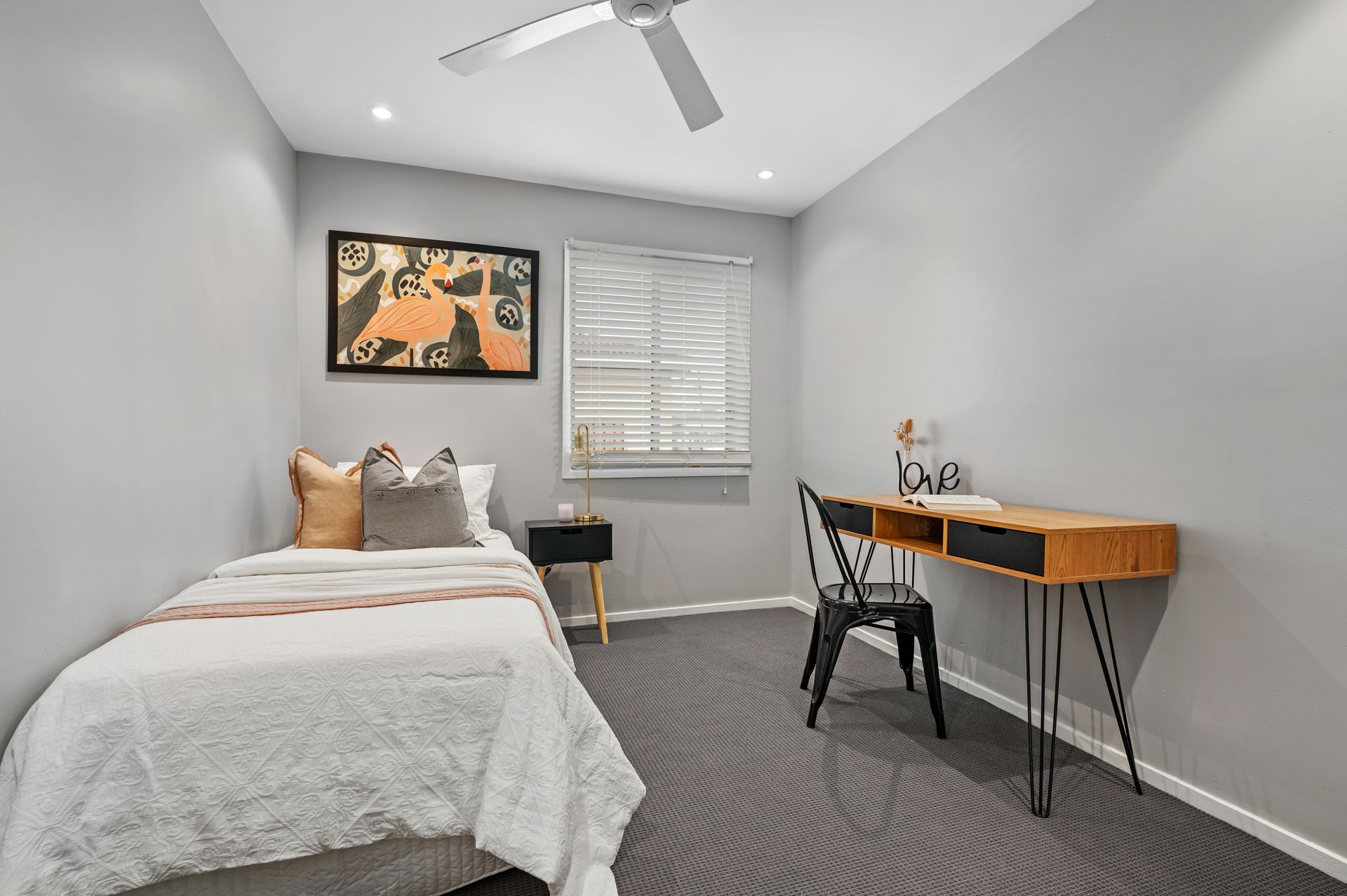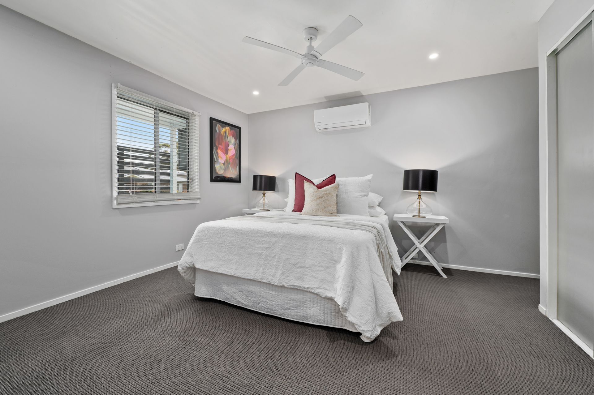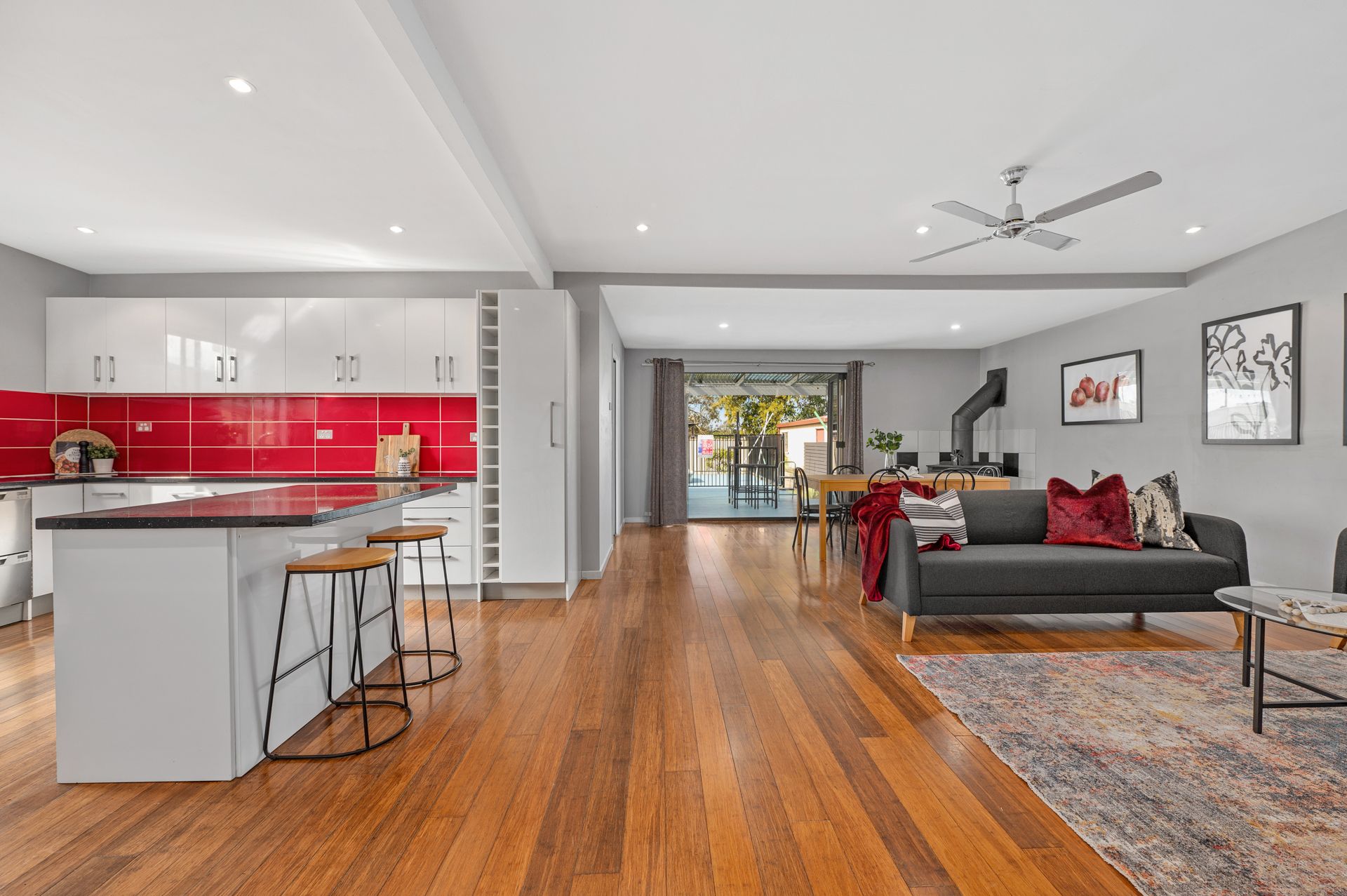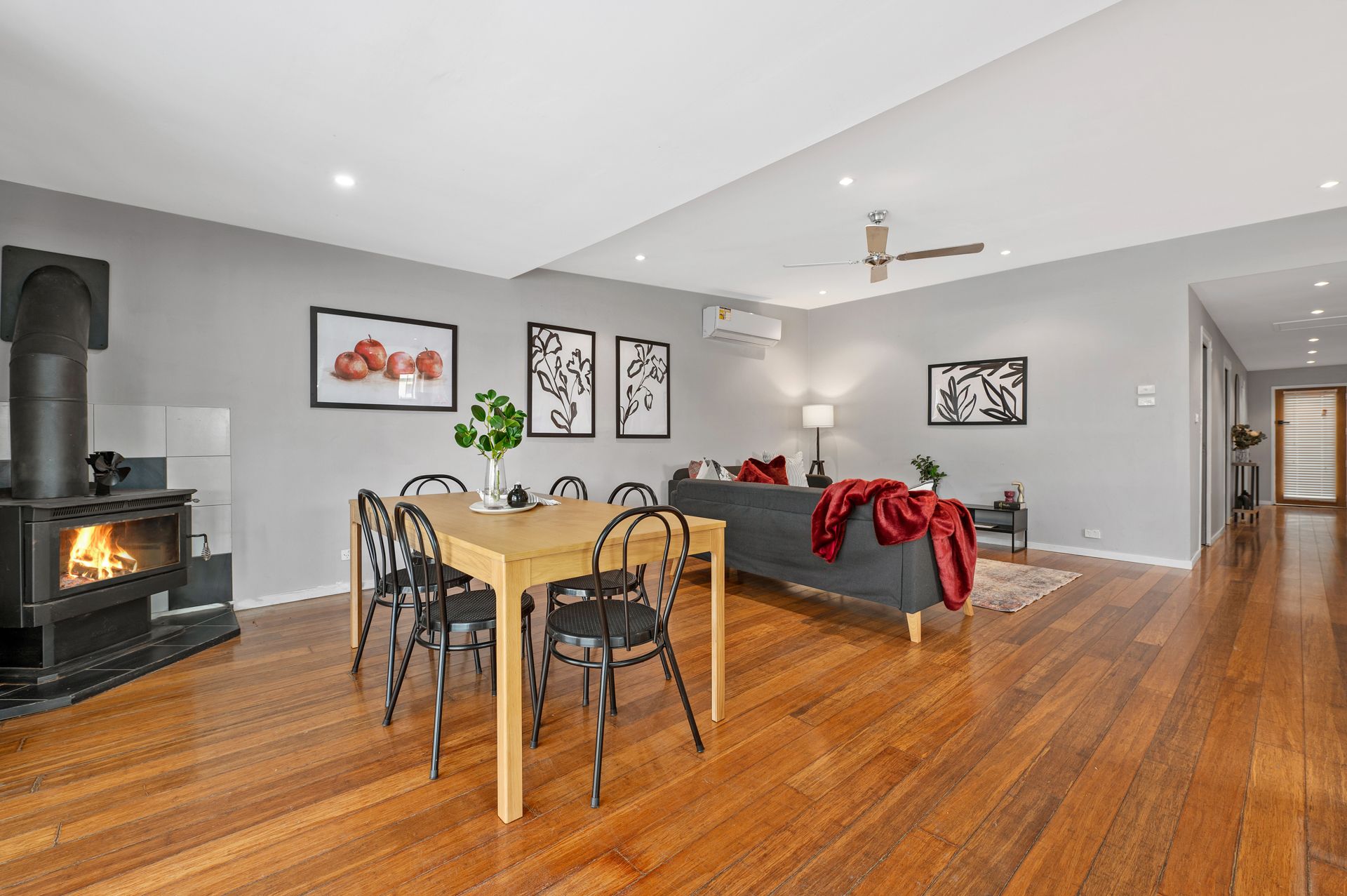 - Open living/dining with fireplace, ceiling fans and split system air con
