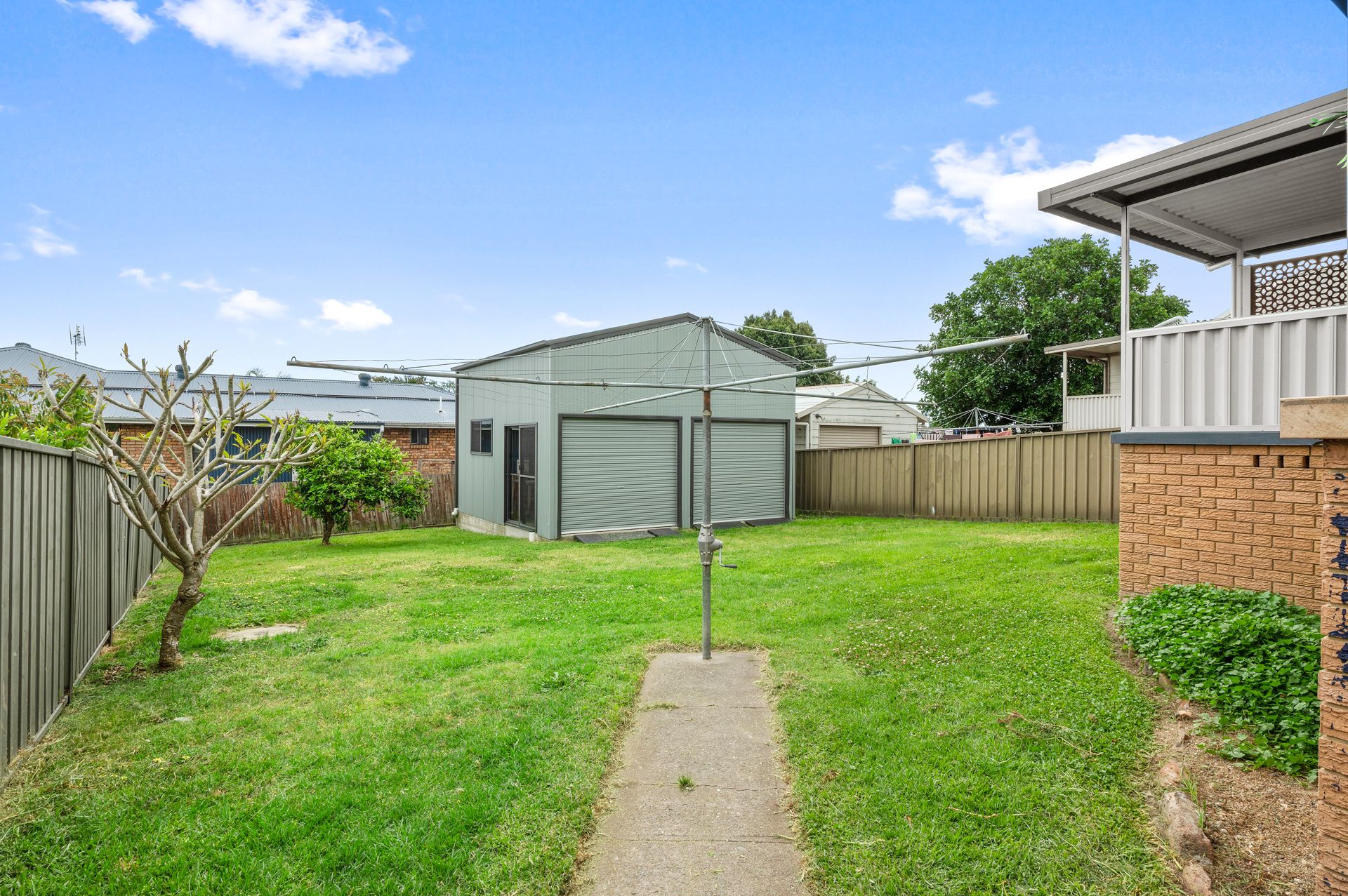 - Drive-through carport; large detached double garage in backyard
