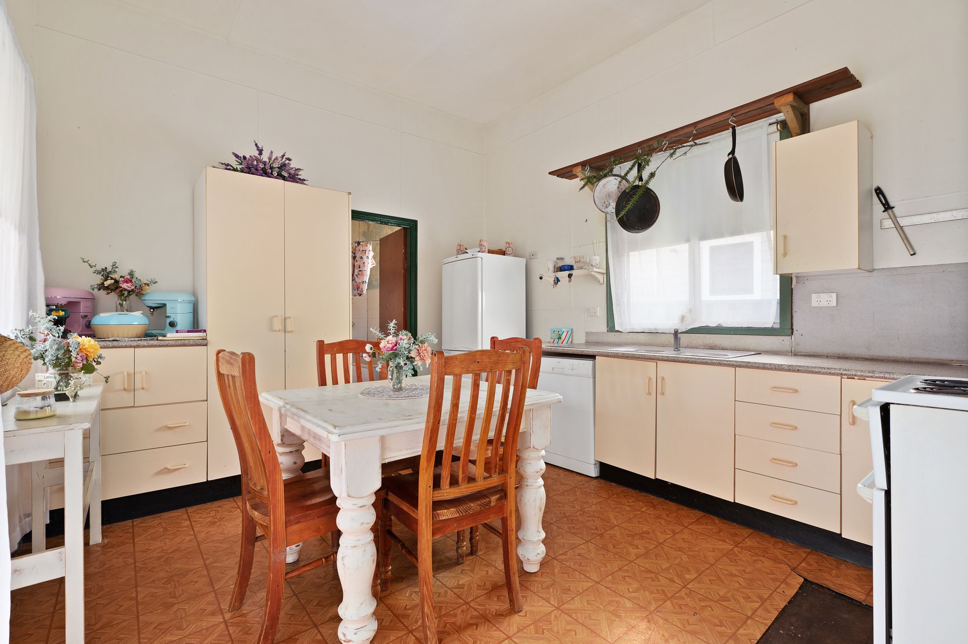 Its pleasant interior combines old world charm with high ceilings and led light windows with modern conveniences such as air conditioning and ceiling fans throughout. The core living area is joined by a large eat-in kitchen, complete with plenty of cabinetry and easy service to the backyard.