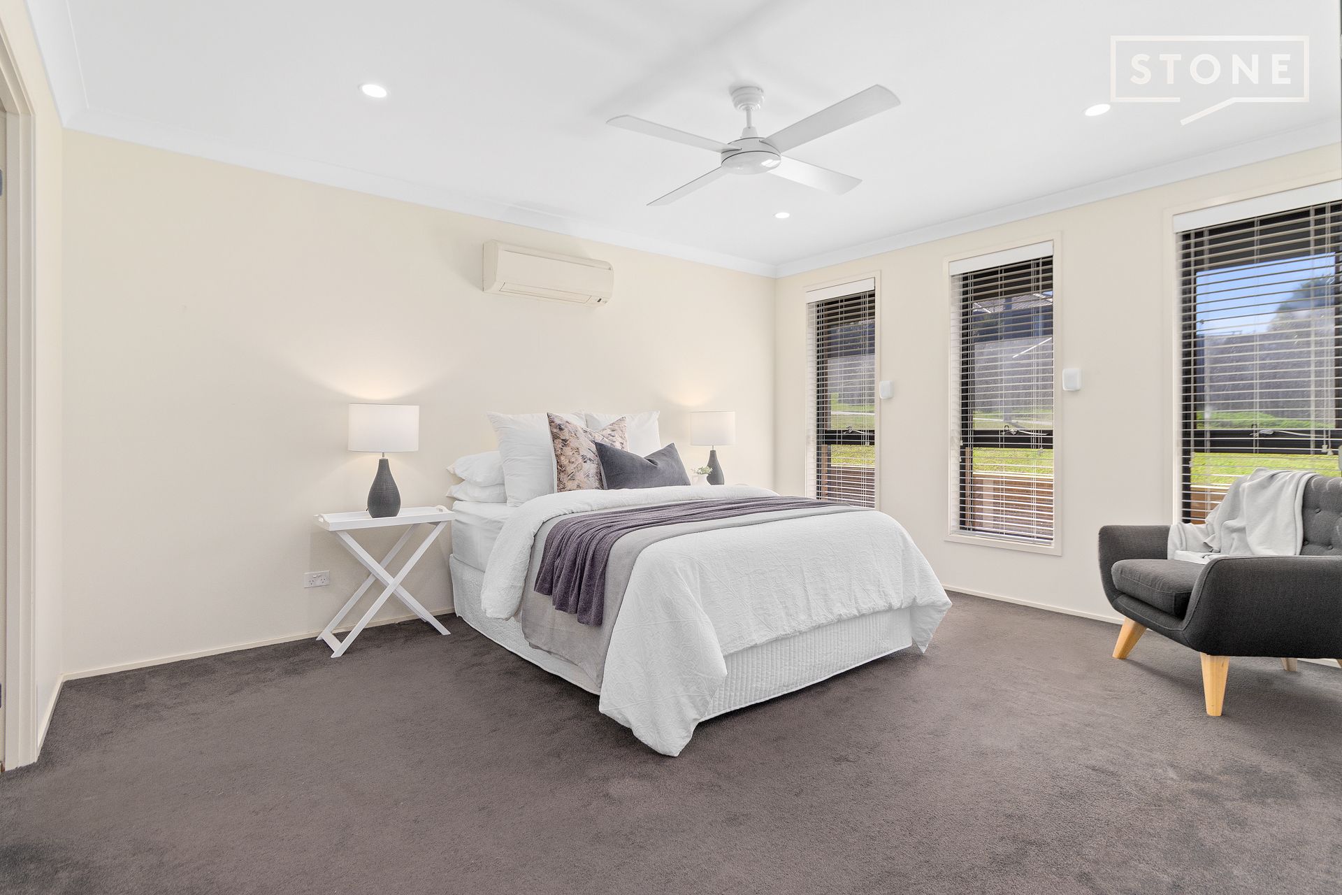 - Ceiling fans to bedrooms, air-conditioning to living and master bedroom
