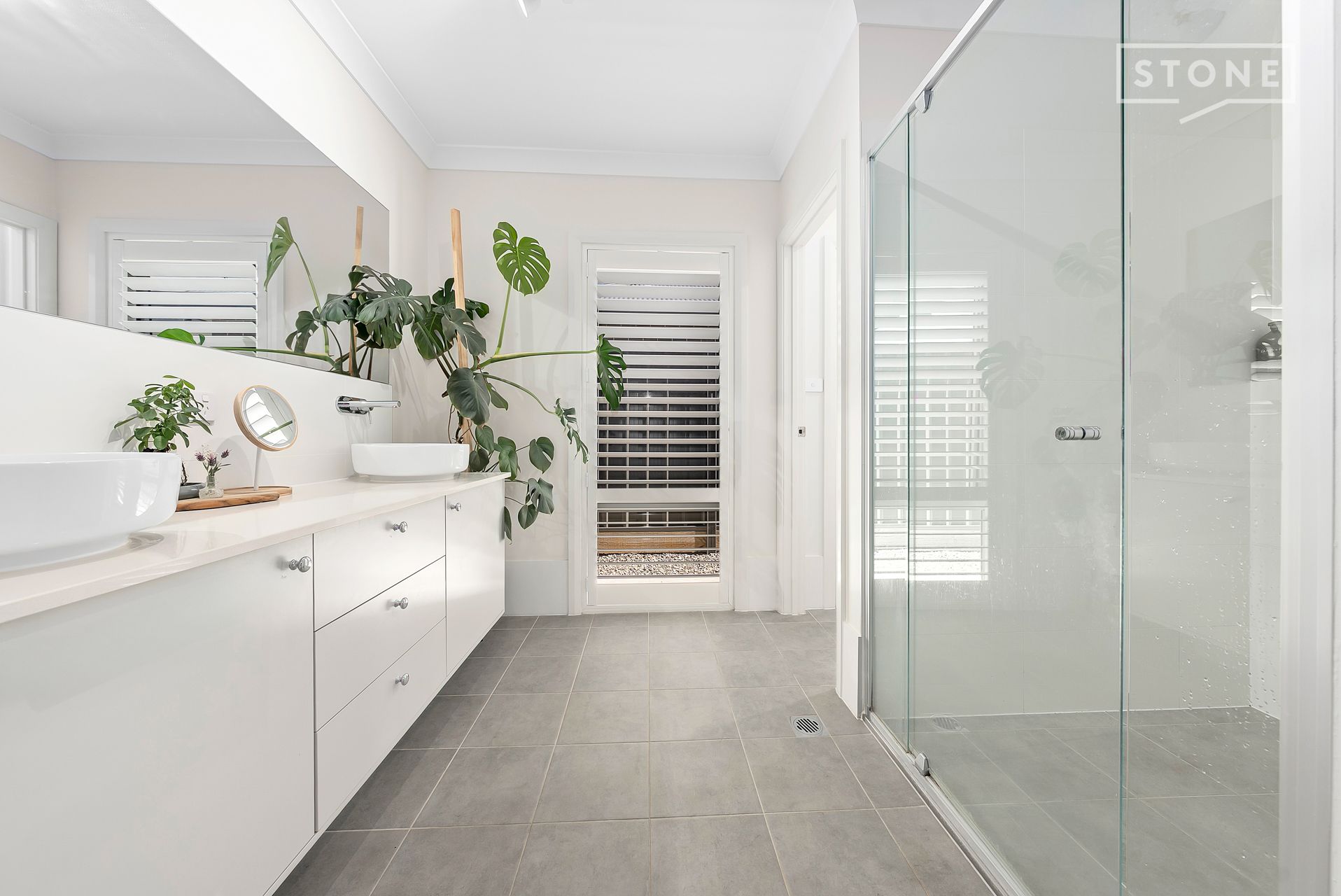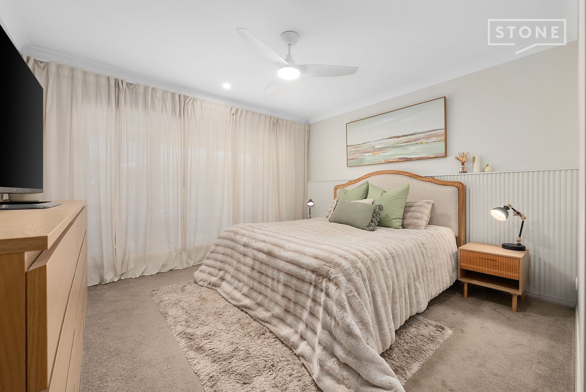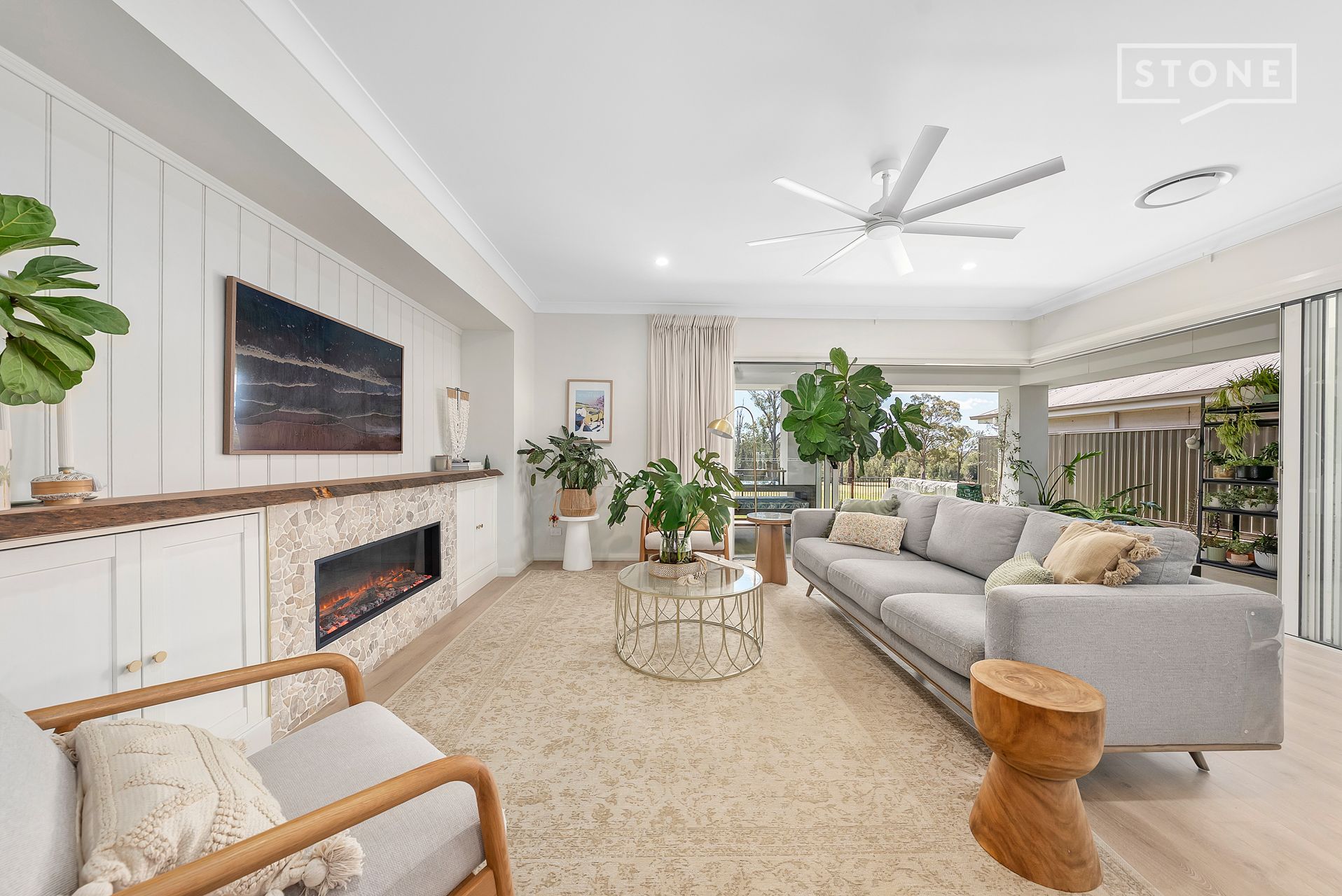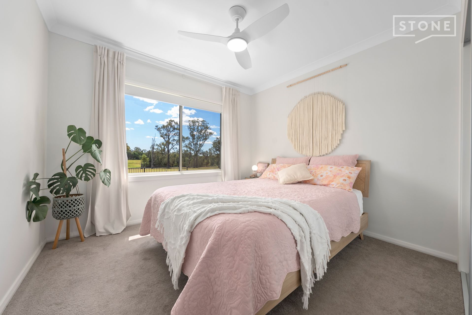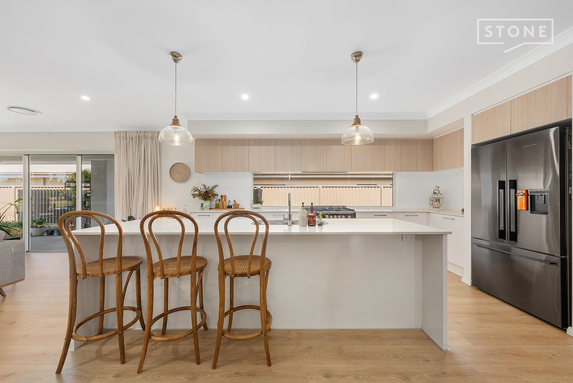 The chef's kitchen is a statement in form and function, featuring 20mm stone benchtops, a 900mm Fisher & Paykel gas cooktop, integrated microwave and dishwasher, plumbed fridge point, and an expansive walk-in pantry. The master suite enjoys garden views through semi-sheer curtains, with automated blinds providing privacy, a generous walk-through robe, and a double vanity ensuite with an oversized shower.