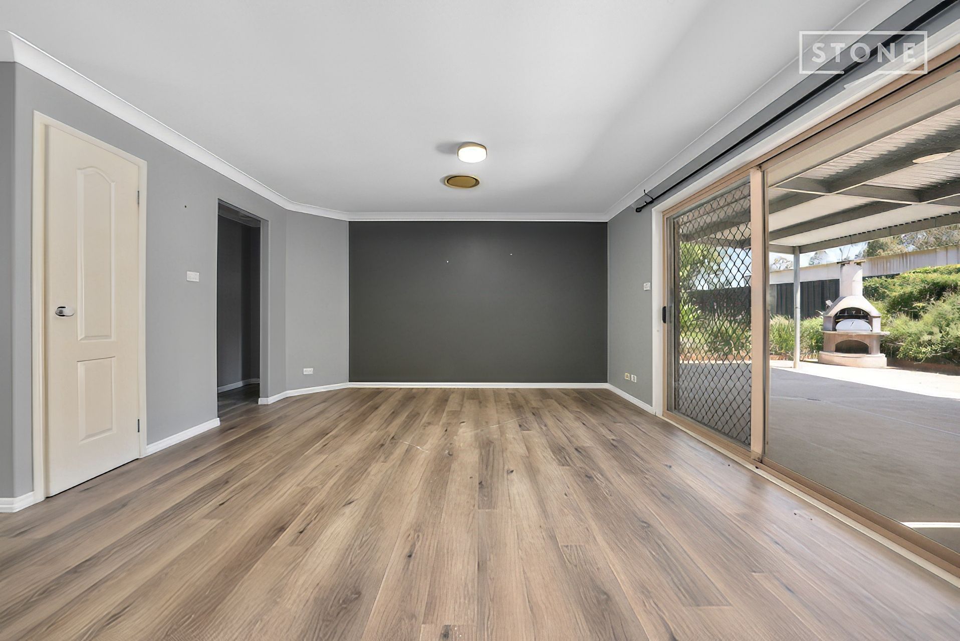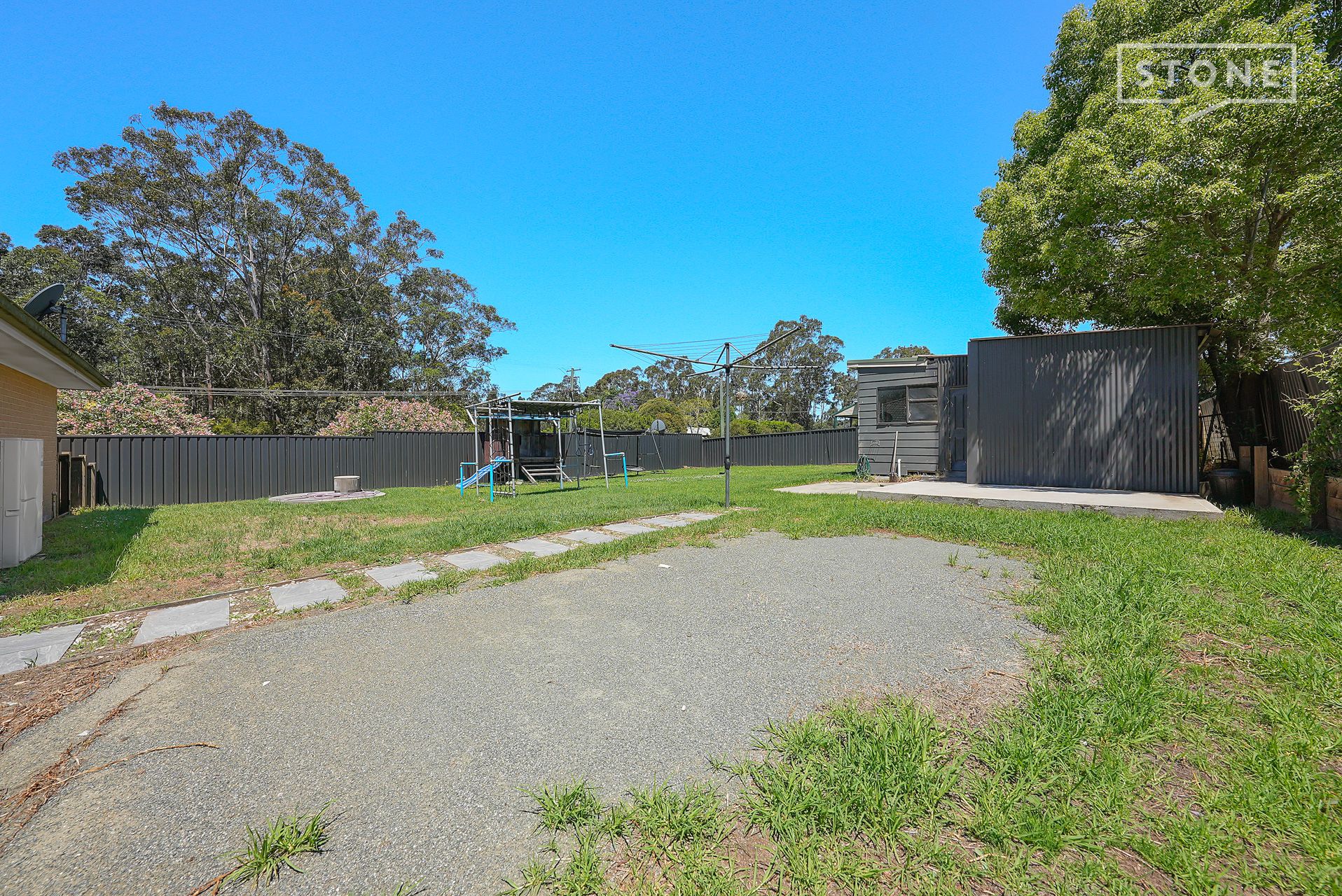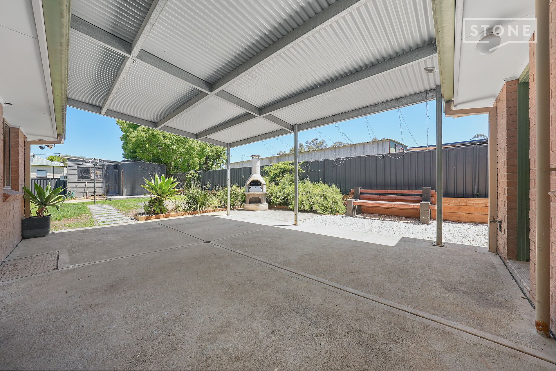 - Covered entertaining area with pizza oven overlooking level lawns